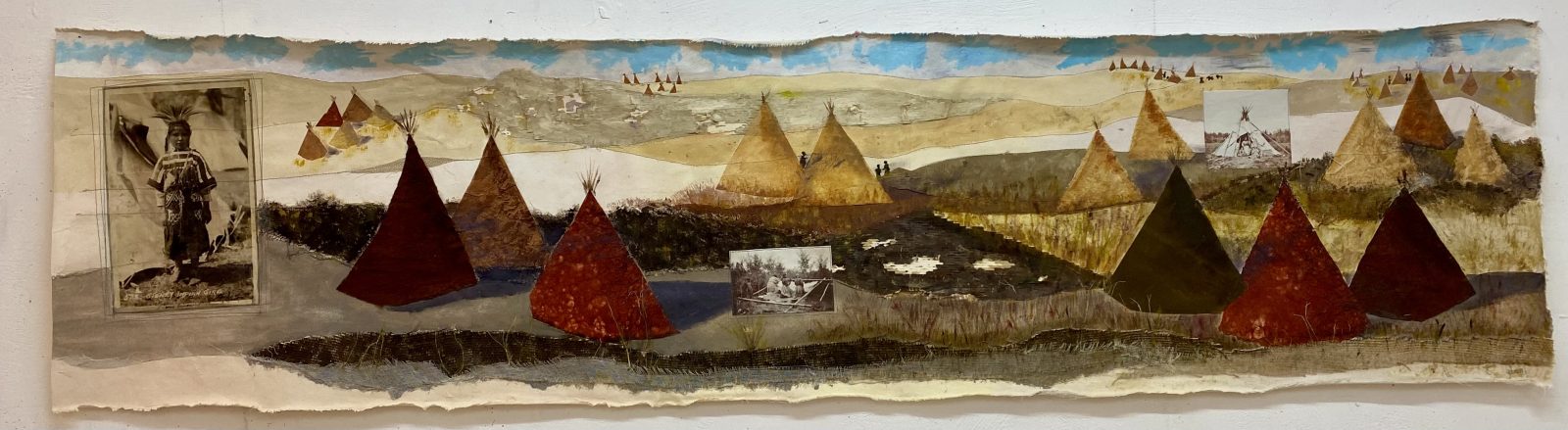 Cotton, paper, polyester, photo ink, acrylic paint, thread